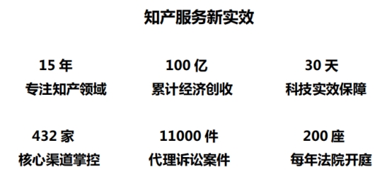 作为专注知产领域15年的律联而言,始终践行新实效主义理念。在知产法律服务中,律联拥有国内知产领域资深法律服务团队,从源头直接打击侵权行为,解决行业知产维权六大难题,通过遍历全国400 多家城市联动调查取证,平均30 天即可见效,累计超过11000 件知产诉讼案件代理;同时在知产市场服务中,律联掌握全国432 座城市经销网点,帮助企业实现精准渠道导入,拥有国内知名智力团队全程保障支持,深度驱动11000+企业市场增量近87.5%,累计创收100 亿,成功助力企业实现市场份额提升及市场品牌化战略运作!